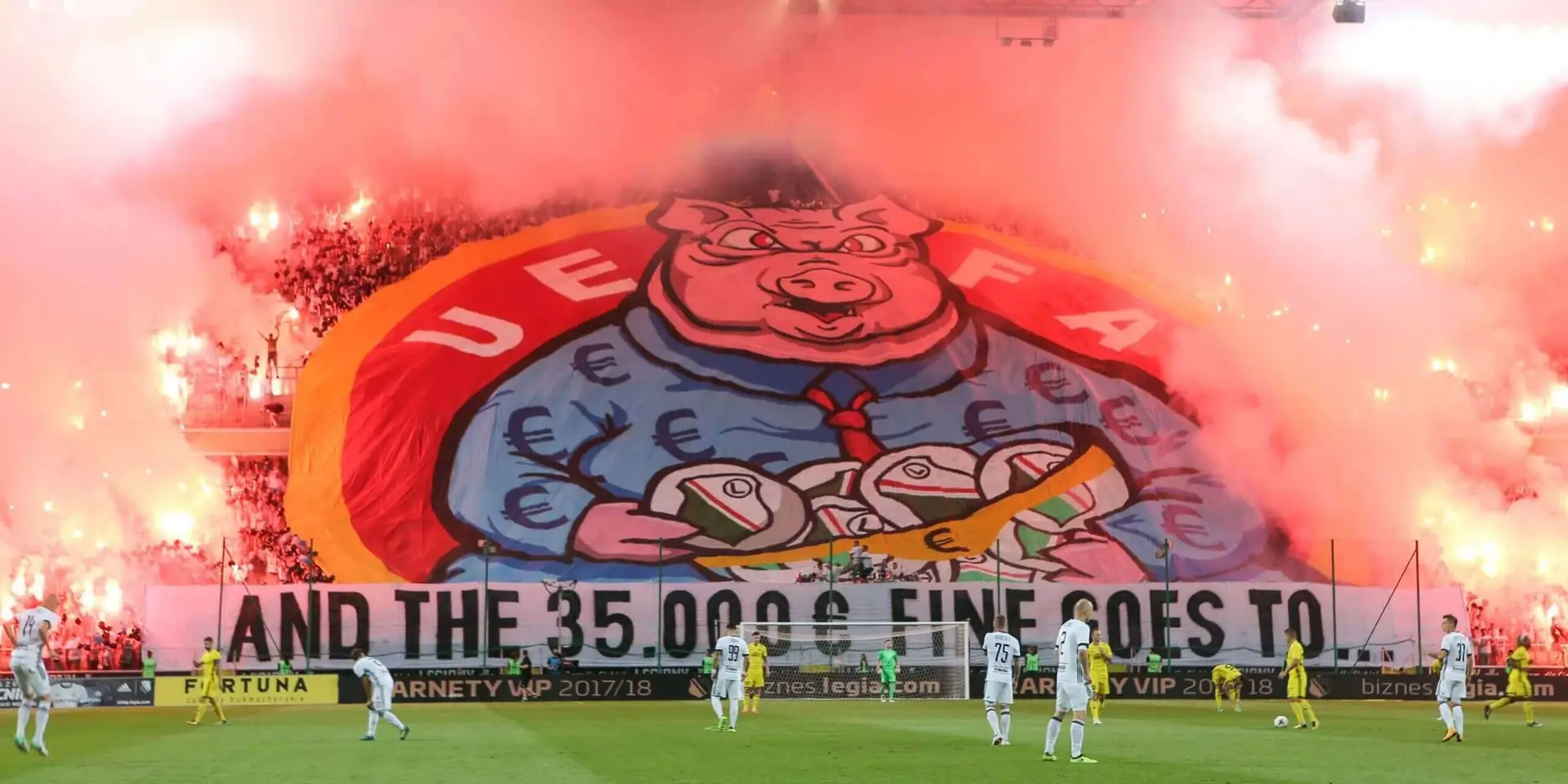 Αν οι οπαδοί της Μάντσεστερ Σίτι, οι οποίοι αποδοκιμάζουν τον ύμνο του Champions League, βλέπουν με κακό μάτι την UEFA, αυτό δεν έχει καμία σχέση με τη Λέγκια. Πρόκειται για τον σύλλογο που κάποτε εμφάνισε ένα γιγαντιαίο πανό που απεικόνιζε ένα γουρούνι καρτούν που μετρούσε τα χρήματα της Λέγκια με φόντο το λογότυπο της UEFA το 2017 και έγραφε: «Και το πρόστιμο των 35.000 ευρώ πηγαίνει σε…».