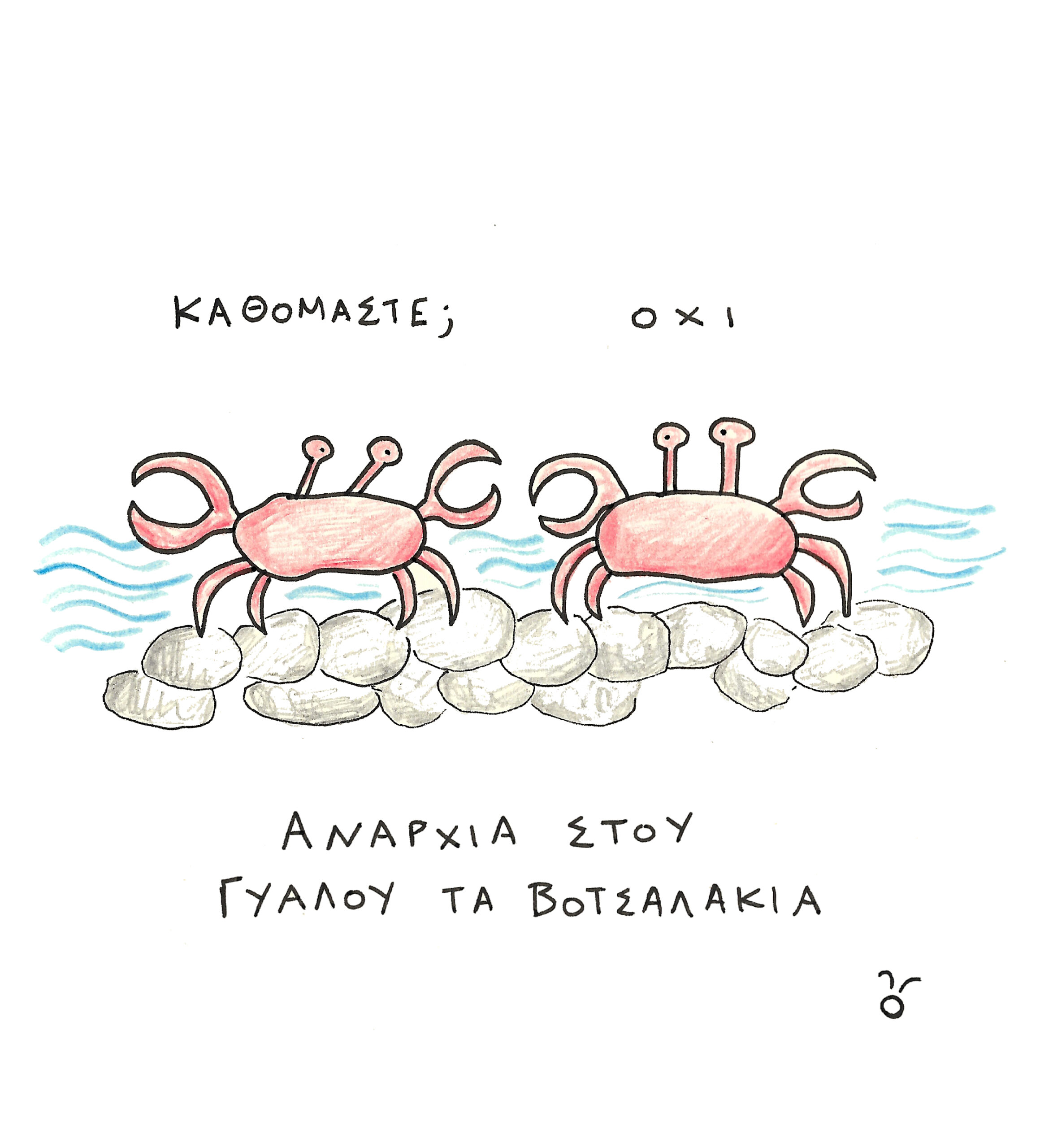 Είμαι πιο κοντά στη σκιτσογραφία -που μου αρέσει πολύ και ως λέξη- παρά στη γελοιογραφία. Με έχουν επηρεάσει προφανώς ο Dagsson, ο Quinno, o Saul Steinberg και η Liana Finck -από το New Yorker και οι δύο.