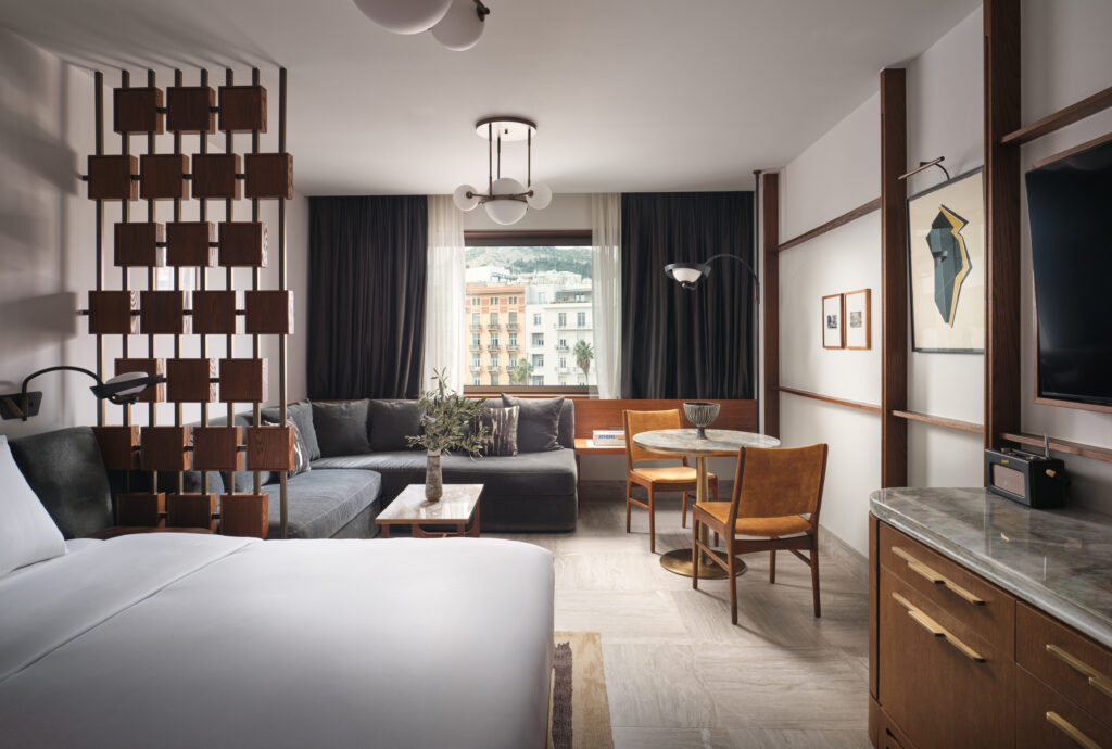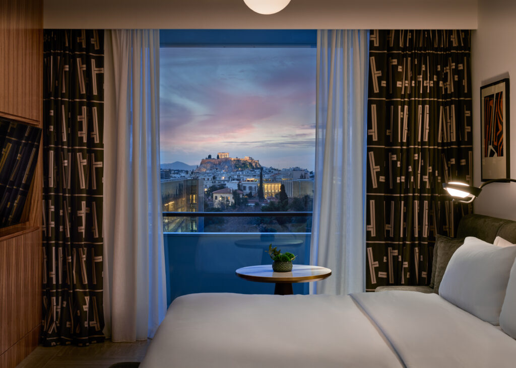 Τα 278 δωμάτια και σουίτες έχουν σχεδιαστεί για να αφήνουν την πόλη να εισχωρεί διακριτικά στο εσωτερικό τους. Τα ιδιωτικά μπαλκόνια λειτουργούν σαν μικρά παρατηρητήρια προς την Ακρόπολη και τον αστικό ορίζοντα, ενώ οι μεγαλύτερες σουίτες, συμπεριλαμβανομένων των Presidential και της επερχόμενης penthouse εμπειρίας, προσφέρουν μια αίσθηση ιδιωτικότητας που δύσκολα βρίσκει κανείς στο κέντρο της πόλης.