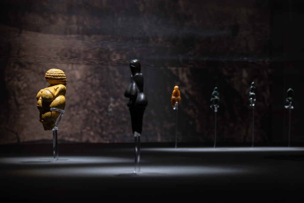 Τα πιστοποιημένα αντίγραφα βρίσκονται σε ένα δωμάτιο που έχει μετατραπεί σε «σπηλιά», με ελάχιστο φως και ήχο νερού που στάζει από σταλακτίτες, για να φέρει στο παρόν τις συνθήκες μέσα στις οποίες γεννήθηκαν τα παλαιολιθικά ειδώλια που απεικονίζουν γυναικείες μορφές. Οι μορφές αυτές γεννήθηκαν μέσα σε μήτρες ενός παμπάλαιου κόσμου που συνομιλεί με τον τωρινό χάρη στην τέχνη. Αυτό είναι η Balloon Venus Lespugue (Orange) του Jeff Koons, ένας καθρέφτης που όταν στεκόμαστε απέναντι του βλέπουμε μέσα του το παρόν αλλά και το παρελθόν μας. Το θέμα είναι, μπορούμε άραγε να δούμε και το μέλλον μας ως ανθρωπότητα;