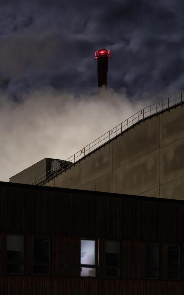 Τραβηγμένη μέσα σε μια σκοτεινή νύχτα, αυτή η εικόνα ενός χαρτοποιείου στην Ομπόλα της Σουηδίας αποκαλύπτει διαδοχικά επίπεδα σκιών, μπετόν, σύννεφων και ουρανού.