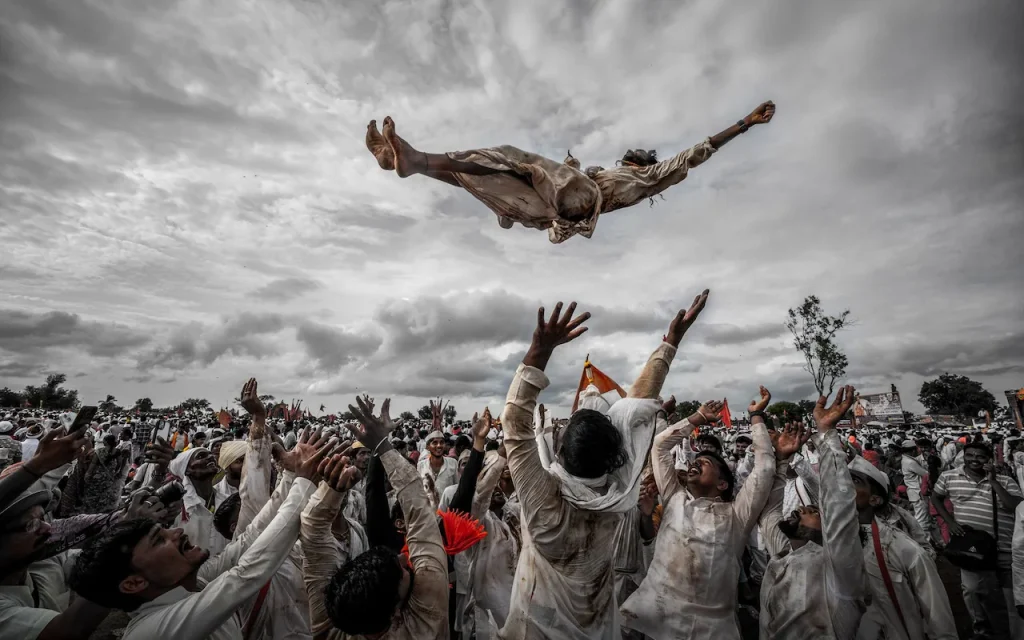 Προσκυνητές πετούν στον αέρα έναν ασκητή, ντυμένο ως θεϊκή μορφή, κατά τη διάρκεια του Ashadi Wari, ενός ξυπόλυτου προσκυνήματος προς την Παντχαρπούρ στην Ινδία. Η πράξη πίστης συμβολίζει την πνευματική ενότητα, την αντοχή και την ταπεινότητα των προσκυνητών.
