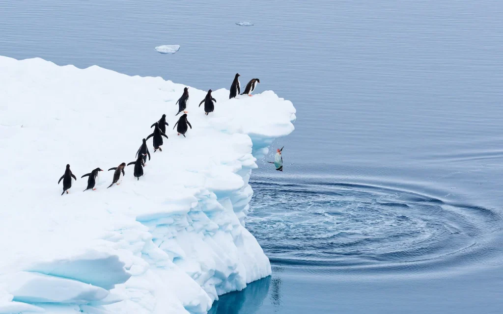 Μια ομάδα πιγκουίνων gentoo παρατάσσεται για να πηδήξει στον Ανταρκτικό Ωκεανό.