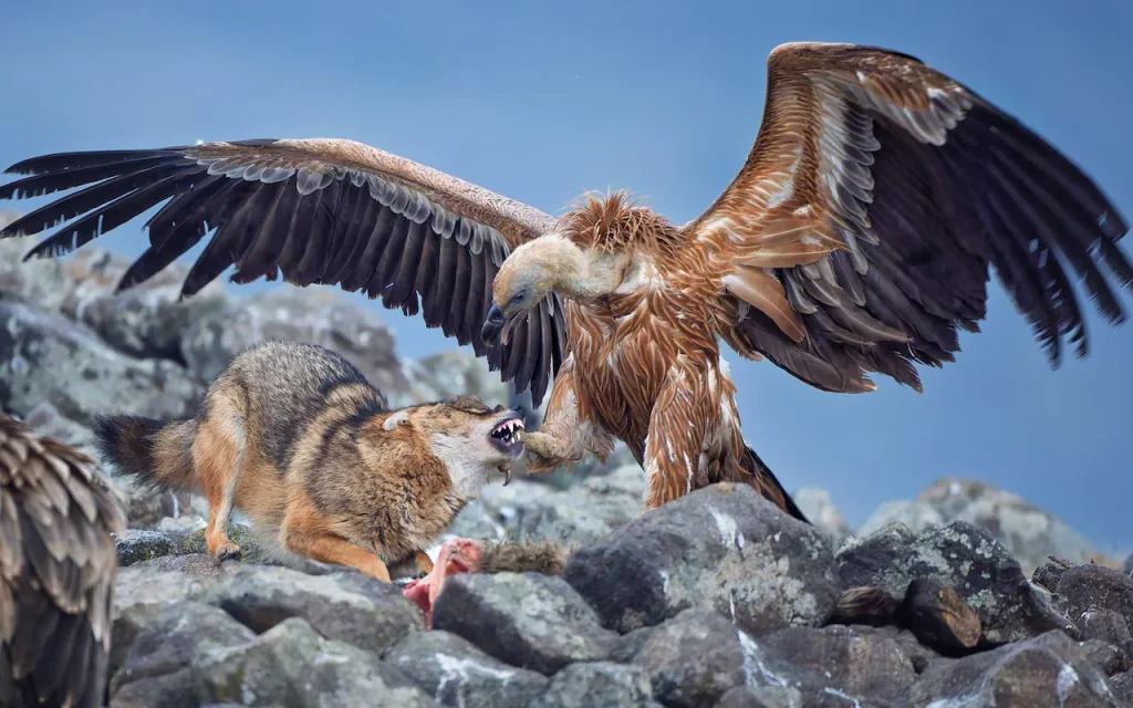Ένας ασπροπάρης συγκρούεται με ένα χρυσό τσακάλι στα βουνά της Βουλγαρίας.