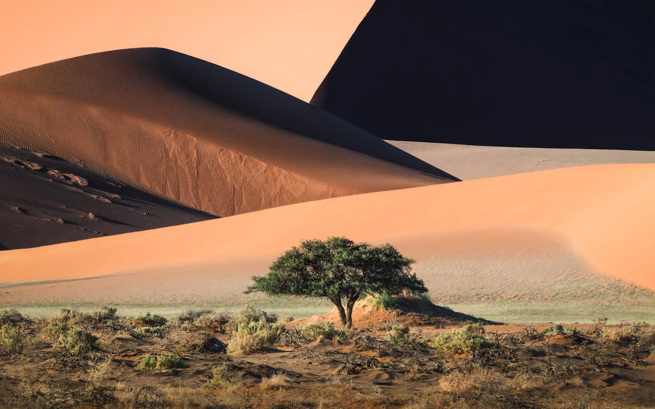 Το πρώτο φως της ημέρας αναδεικνύει τα πλούσια παστέλ χρώματα των αμμόλοφων του Sossusvlei στη Ναμίμπια. Η αντίθεση ανάμεσα στο πράσινο και τις απαλές ροδακινί αποχρώσεις σχεδόν κατακλύζει τις αισθήσεις, ενώ τα μοτίβα και οι υφές που αναδύονται από τις σκιές χαρίζουν στο τοπίο μια ξεχωριστή, ζωγραφική όψη.