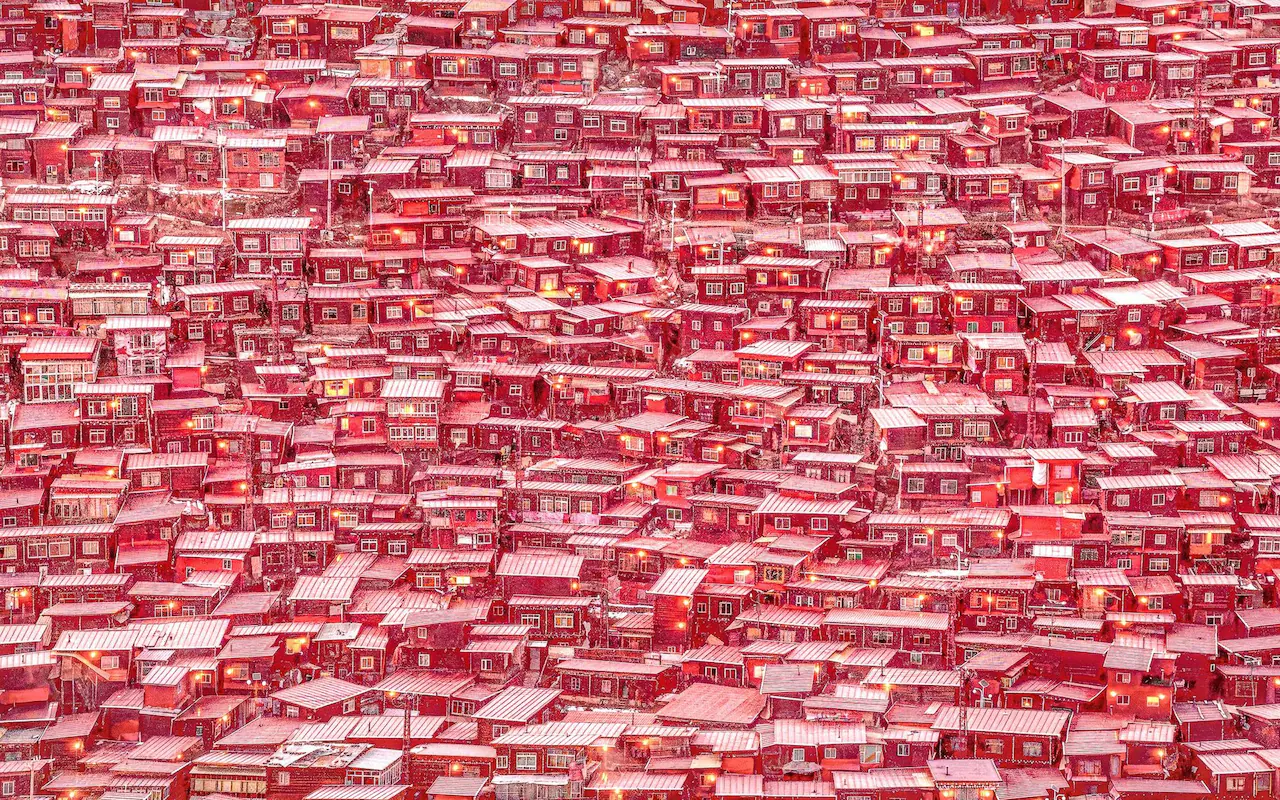 Το πρώτο χιόνι του 2025 πέφτει απαλά στα κελιά των μοναχών, σε αντίθεση με τους κόκκινους (βερμιγιόν) τοίχους. Μέσα στα κενά που αφήνουν το κόκκινο και το λευκό απλώνεται η γαλήνη του βουδιστικού τοπίου.