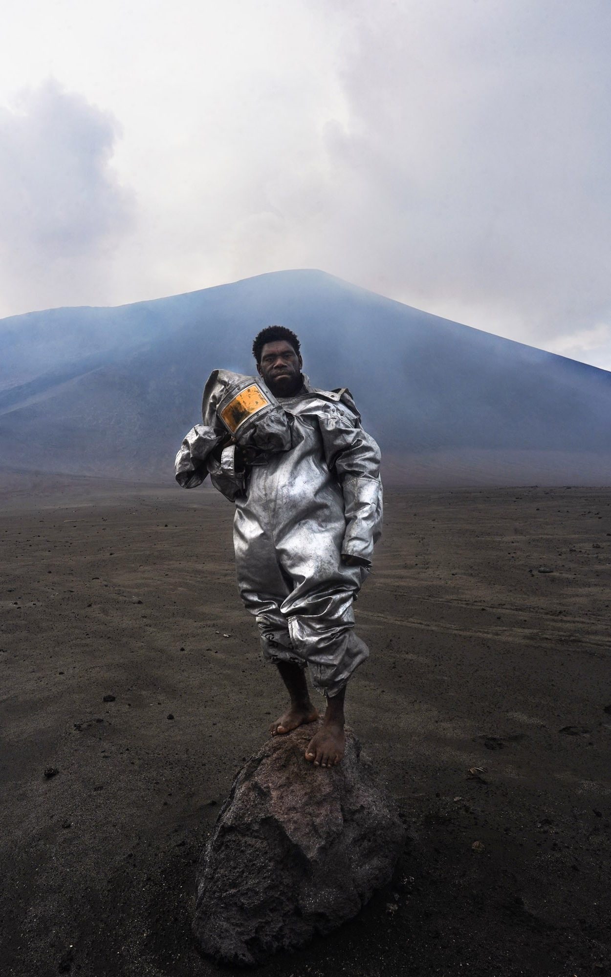 Ο Phillip, αυτοδίδακτος ηφαιστειολόγος, στέκεται ξυπόλυτος στην κορυφή του όρους Yasur στο νησί Τάννα του Βανουάτου. Φορά μια στολή προστασίας από λάβα — δώρο ερευνητών που τον επισκέφθηκαν — ενώ πίσω του το ηφαίστειο καπνίζει, στέλνοντας στον ουρανό ένα νέφος αερίων και θείου. Μεγαλωμένος κάτω από το ενεργό ηφαίστειο, το πορτρέτο τον αποτυπώνει πραγματικά στο φυσικό του περιβάλλον.