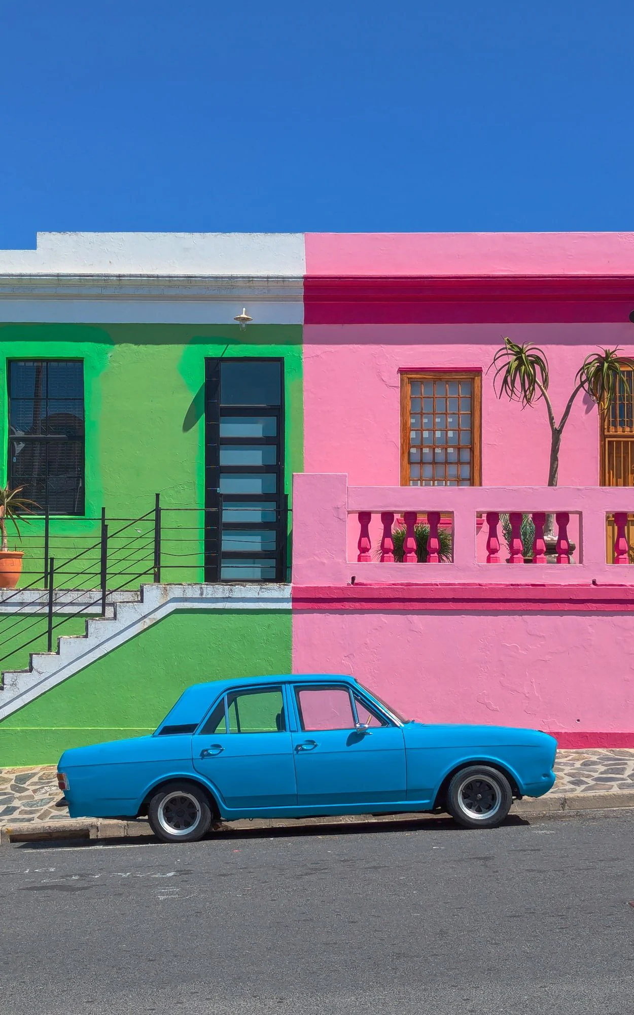 Τραβηγμένη στη γειτονιά Bo-Kaap του Κέιπ Τάουν στη Νότια Αφρική, μια παρκαρισμένη voiture στέκεται μπροστά σε μια έντονα χωρισμένη πολύχρωμη πρόσοψη. Η σύνθεση ισορροπεί ανάμεσα στη γεωμετρία και τον κορεσμό των χρωμάτων. Η καθημερινή αρχιτεκτονική μετατρέπεται σε γραφική, συνειδητή εικόνα, αποκαλύπτοντας πώς το χρώμα και ο τόπος διαμορφώνουν την αστική ταυτότητα.