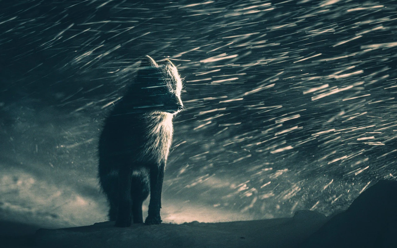 Μια μπλε αρκτική αλεπού μέσα σε χιονοθύελλα, φωτογραφημένη στη Χερσόνησο Varanger στη Νορβηγία.