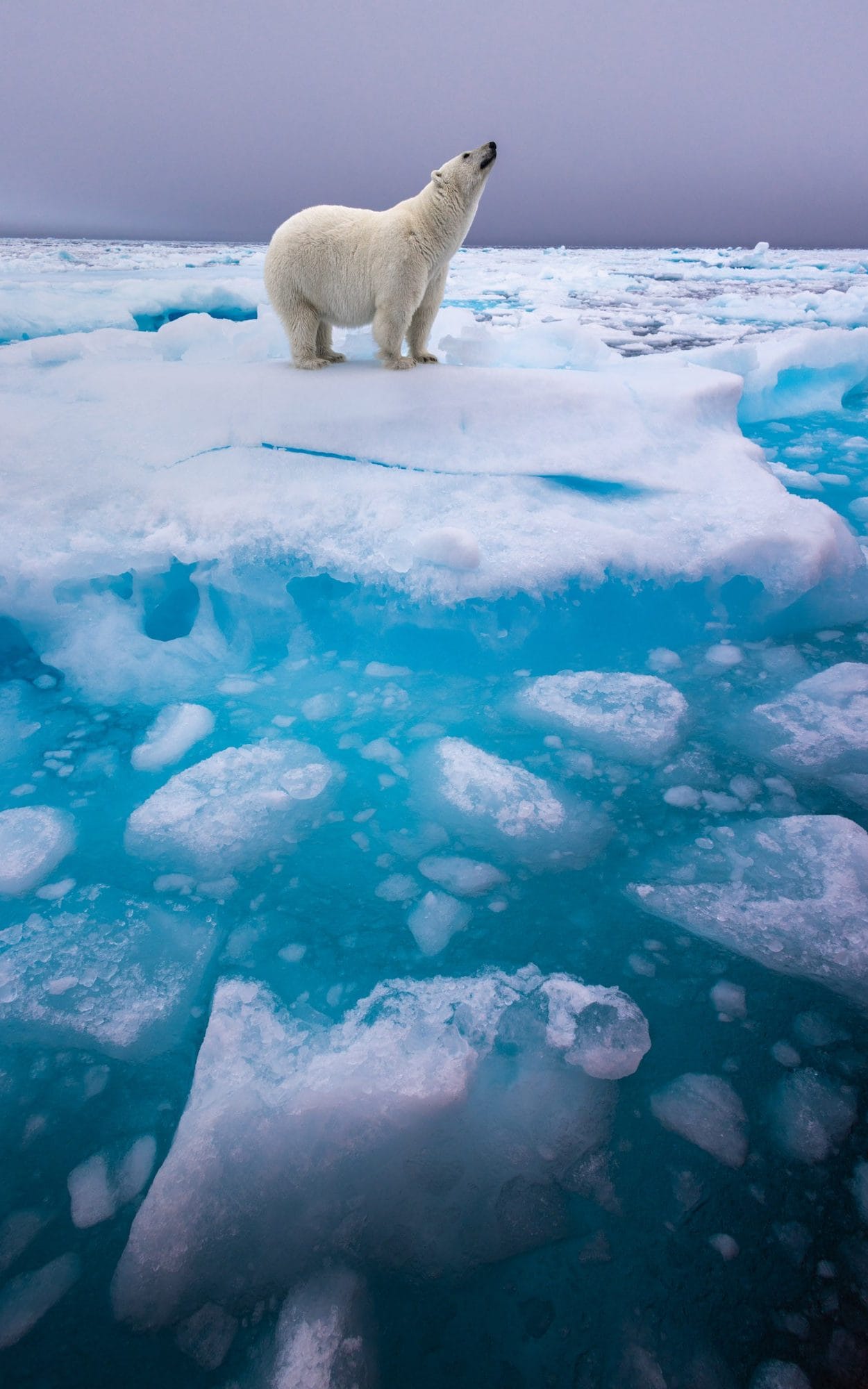 Μια πολική αρκούδα στέκεται στην άκρη της παγωμένης θάλασσας, σύμβολο αντοχής απέναντι σε ένα μεταβαλλόμενο κλίμα.