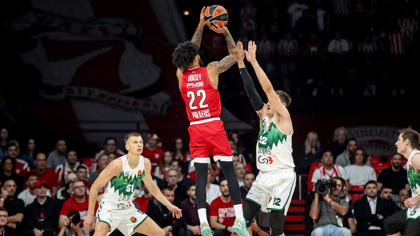 Ο γκαρντ του Ολυμπιακού άνοιξε το σκορ με ένα τζάμπερ πριν πετύχει ένα πούλ-απ από το αγκώνα για το 4-2. Η Ζαλγκίρις αντέδρασε με τον Έντγκαρας Ουλάνοβας να πετυχαίνει δύο ελεύθερες βολές, αλλά ο Ντόρσεϊ πέτυχε ένα τρίποντο και στη συνέχεια δύο καλάθια από κοντά, σημειώνοντας 12 από τους πρώτους 14 πόντους του Ολυμπιακού για το 14-9. Έχοντας δώσει τον τόνο από νωρίς, ο Ντόρσεϊ παρέδωσε τη σκυτάλη στον Νίκολα Μιλουτίνοφ, ο οποίος τελείωσε το πρώτο τέταρτο με 7 πόντους, με τον Ολυμπιακό να έχει διψήφιο προβάδισμα (28-14) μετά από 10 λεπτά. Η ελληνική ομάδα δεν κοίταξε ποτέ πίσω, με τον Ντόρσεϊ να τελειώνει το πρώτο ημίχρονο με 15 πόντους και την ομάδα του να προηγείται 50-36 στο ημίχρονο.